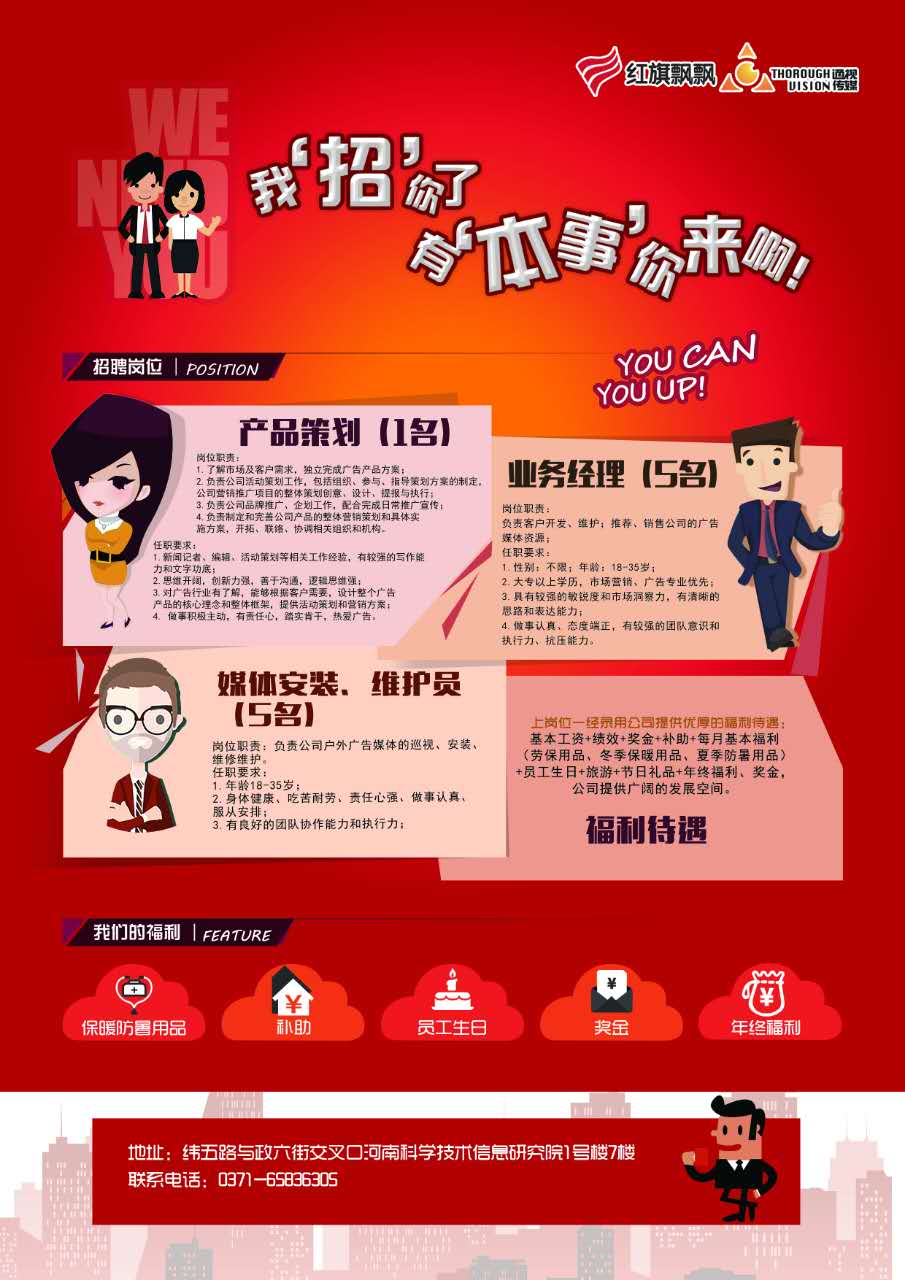 河南紅旗飄飄文化傳播股份有限公司成立于1999年,獨家運營鄭州市所有的公交站牌媒體資源,是一家集出行圈、消費圈、居住圈為一體的綜合型廣告公司。公司2015年與河南人民廣播電臺合作成立專注于中國數(shù)字戶外和移動互聯(lián)網(wǎng)的新媒體子公司—河南通視文化傳播有限公司,公司主營業(yè)務(wù)為依托公交電子站牌廣告、公交新媒體終端廣告等戶外廣告發(fā)布媒體,致力于為客戶提供戶外公交電子站牌廣告及新媒體延展服務(wù)。紅旗始終秉承以人為本的原則,以下職位一經(jīng)錄用公司將提供系統(tǒng)的培訓(xùn)及廣闊的發(fā)展空間!誠邀有志之士加盟!